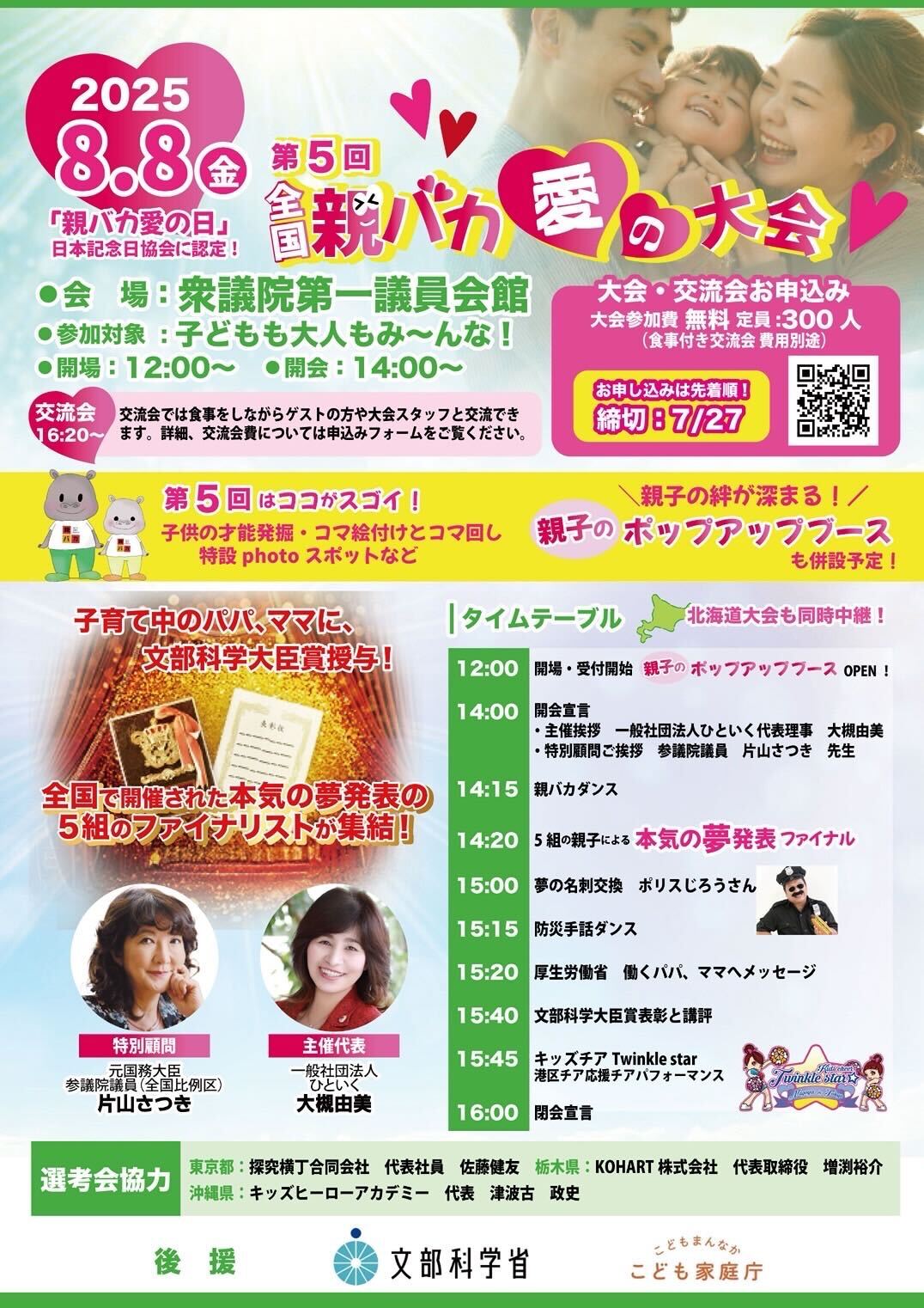 そんなひといくが主催する、最も熱いイベントが「全国親バカ愛の大会」です。親子で一緒に本気の夢発表!夢を叶えた大人の発表を聞こう!親子で夢を叶える大きな第一歩を踏み出しましょう!